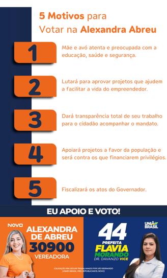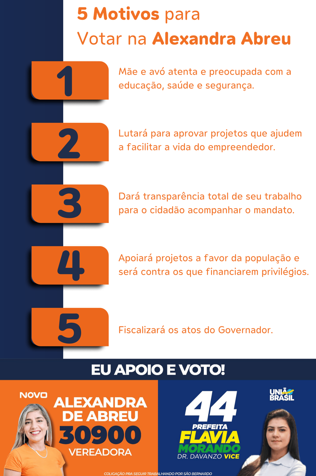 Com garra e determinação, Alexandra Abreu está pronta para lutar por uma São Bernardo melhor! Vote 30900 e apoie quem entende as necessidades da nossa cidade e tem a coragem de fazer diferença. Juntos, podemos transformar nossa comunidade.